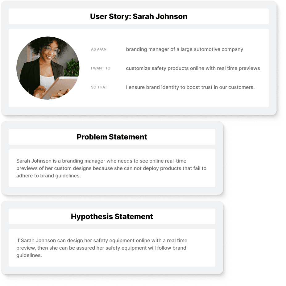 I then crafted three personas, user stories, and problem/hypothesis statements based on research.