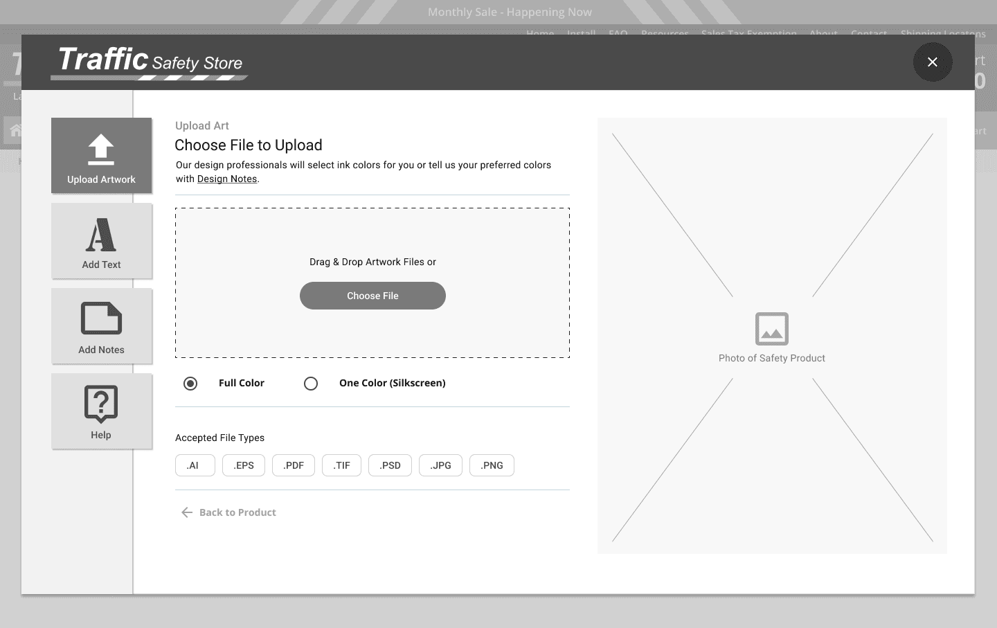 The current process required the customer to email their graphics to Traffic Safety Store's customer service representatives. The in-house graphic designer created proofs and would message the customer back and forth until approval. Printing would then begin, followed by shipment.