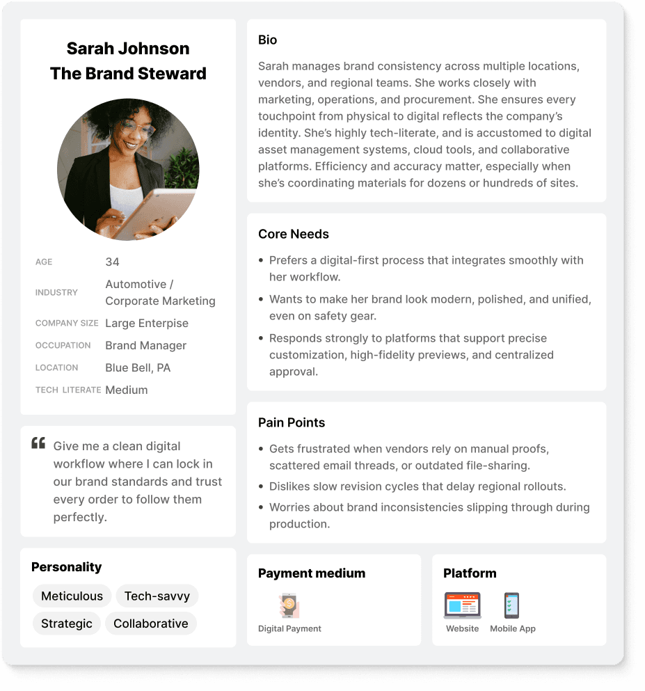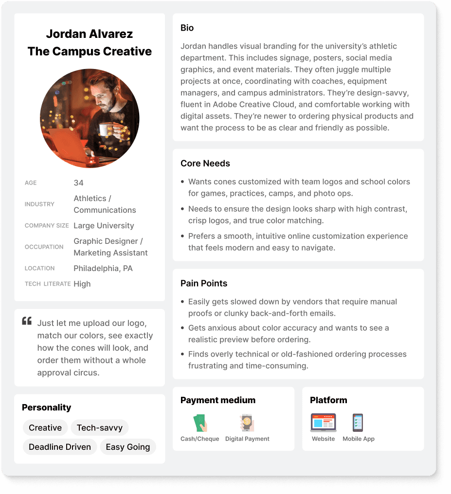 Although we have many users across different demographics and industries, I decided to focus on the three groups who ordered custom products the most. They are small business owners (ex: car washes, dealerships), brand managers (at larger companies like Chik-Fil-A and Toyota), and graphic designers (at government agencies and universities). I took care to reach out to both repeat and first time customers.