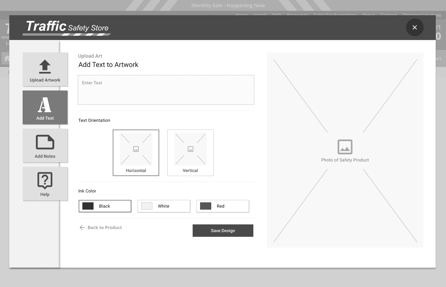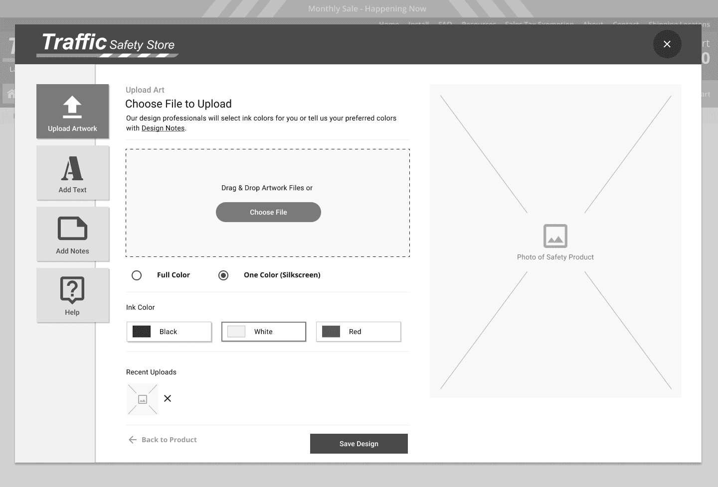 Our users wished to design their products through Traffic Safety Store's website. They desired an experience similar to RushTees and Custom Ink.
